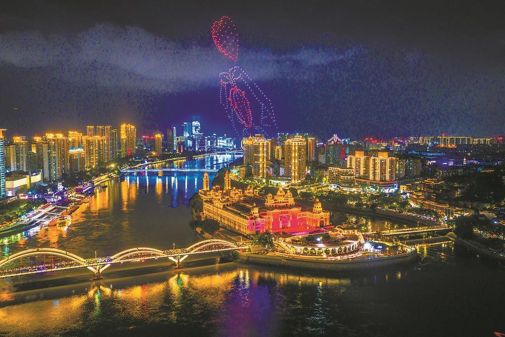 9月29日晚,位于福州市区闽江段的中洲岛举行无人机飞行表演,喜迎国庆、中秋双节。假日期间,这里将推出灯光秀、主题艺术市集、户外音乐节等活动。福建日报通讯员 陈成才 摄