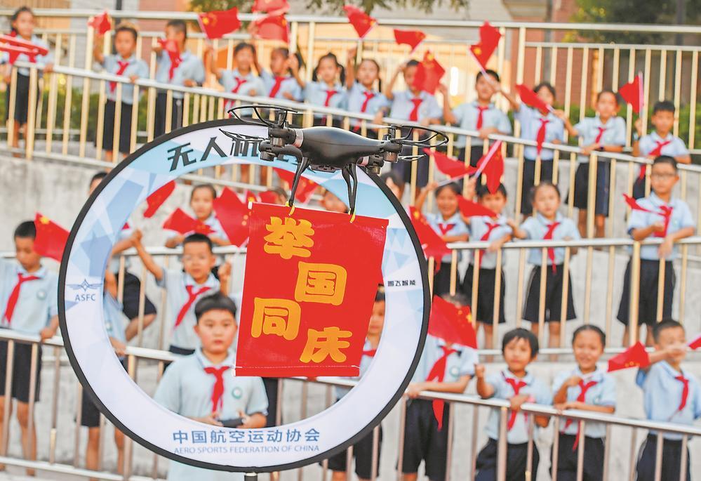 9月28日,泉州市泉港区益海实验小学开展“我为祖国送祝福”主题教育。图为无人机兴趣班的孩子用展示无人机穿越障碍的方式迎接国庆。福建日报通讯员 林弘梫 摄