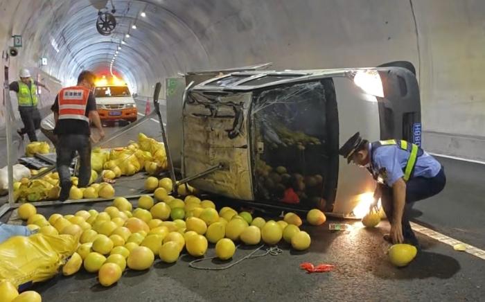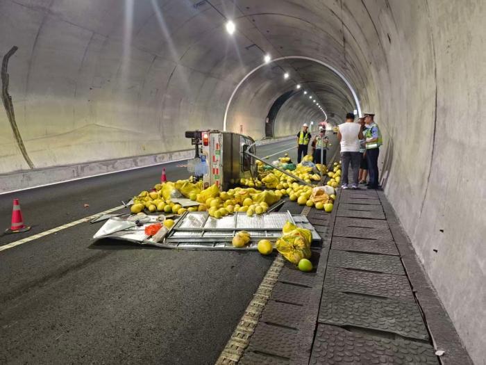 漳州:货车隧道侧翻蜜柚散落 高速执法紧急救援