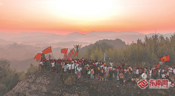 1日,连城县冠豸山风景区迎来客流高峰。图为游客一大早登上山顶看壮丽日出。黄水林 摄