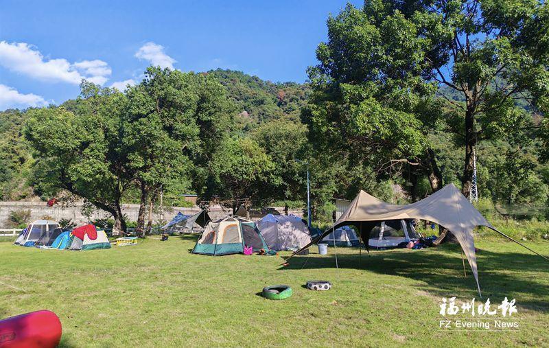 闽侯溪东休闲山庄的草坪上搭起露营帐篷。