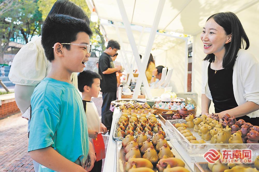 10月2日,在德化红旗坊·文旅产业园,游客在选购陶瓷文创产品。10月1日开园的红旗坊,推出演艺灯光秀、夜经济、创客空间等核心产品,进一步深挖德化的陶瓷文化底蕴,培育特色文创IP,构建产业融合平台,打造陶瓷文化传承、文旅融合发展和国际陶瓷艺术交流窗口。福建日报记者 王毅 摄