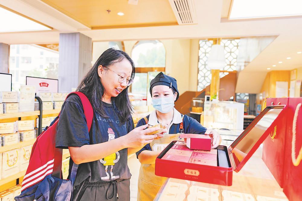国庆中秋假期,龙岩月饼消费市场持续升温。今年的月饼礼盒不仅在包装上更加简约环保,价格也更为亲民。图为消费者在选购月饼。