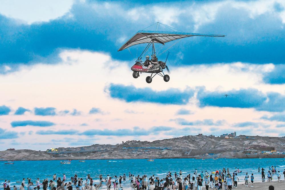 国庆中秋假期,平潭精心策划推出了一系列文旅活动,打造能玩、能逛、能买的多元消费场景。此外,平潭还推出门票减免、折扣优惠等便民惠民举措,持续释放假日文旅消费活力。图为在龙王头海洋公园,游客乘坐动力三角翼从高空俯瞰平潭美景。