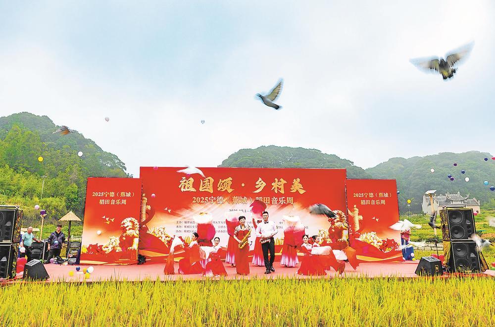 1日至3日,由福建省音乐家协会、福州大学人文社会科学学院及宁德市文联、蕉城区委宣传部联合主办的“祖国颂·乡村美”2025宁德(蕉城)稻田音乐周在蕉城区石后乡下竹洋村举办。本次稻田音乐周将高雅艺术融入丰收景色,为市民游客提供了独特的文化体验。本报通讯员 王志凌 摄