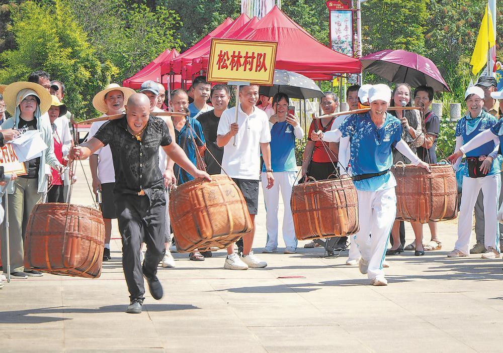 5日,三明市沙县区夏茂镇举办农民丰收节,来自全镇各村和社会各界的9支代表队在挑粮接力、插秧接力、拔河等趣味比赛中感受乡村生活的魅力。图为挑粮接力比赛。本报通讯员 薛辰怡 俞和江 摄
