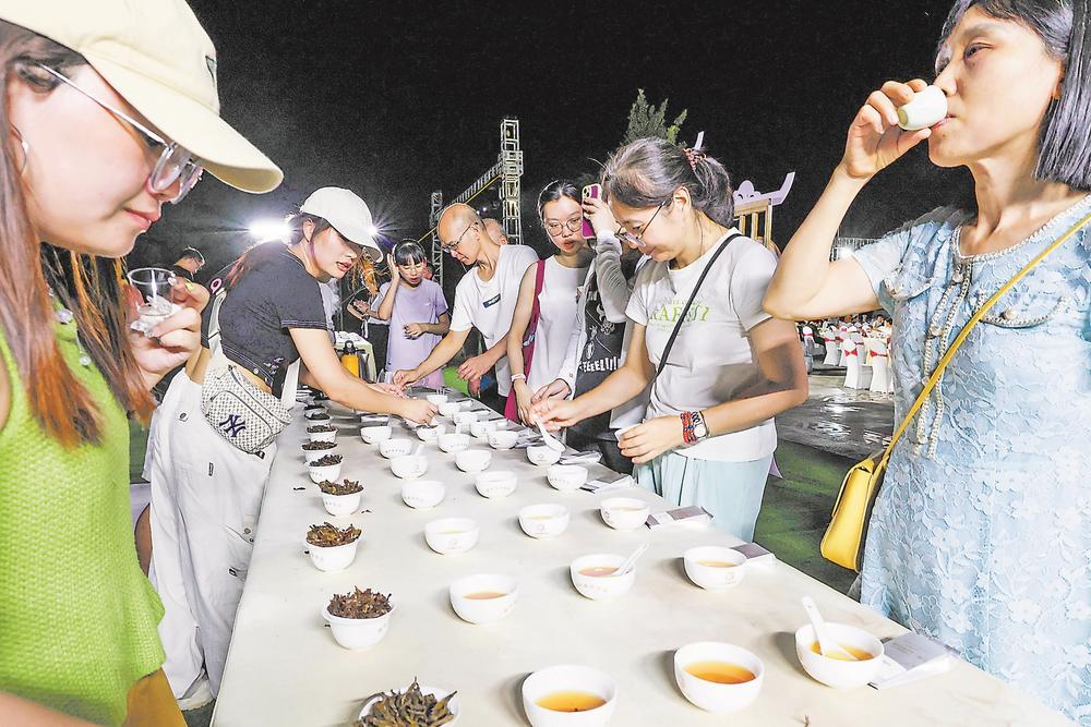 5日晚,茶友在武夷山市茶博园举行的千人品茗斗茶赛上品茶。茶博园广场上,近百张茶席错落分布,这场将持续7天的茶文化盛宴,让八方游客在山水间沉浸式感受武夷岩茶的独特魅力。邱汝泉 摄