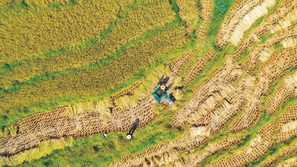 近日,德化县龙门滩镇霞碧村的梯田迎来水稻丰收季。村民们穿梭田间,割稻、打谷、装袋,忙碌身影中满是丰收喜悦。许华森 林婉清 摄
