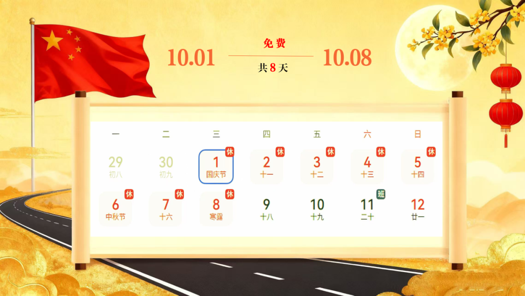 免费通行时间以车辆驶离高速公路出口收费车道的时间为准,即7座以下(含7座)载客车辆,在10月1日0时至10月8日24时之间驶离高速公路出口的,均可享受免费政策。