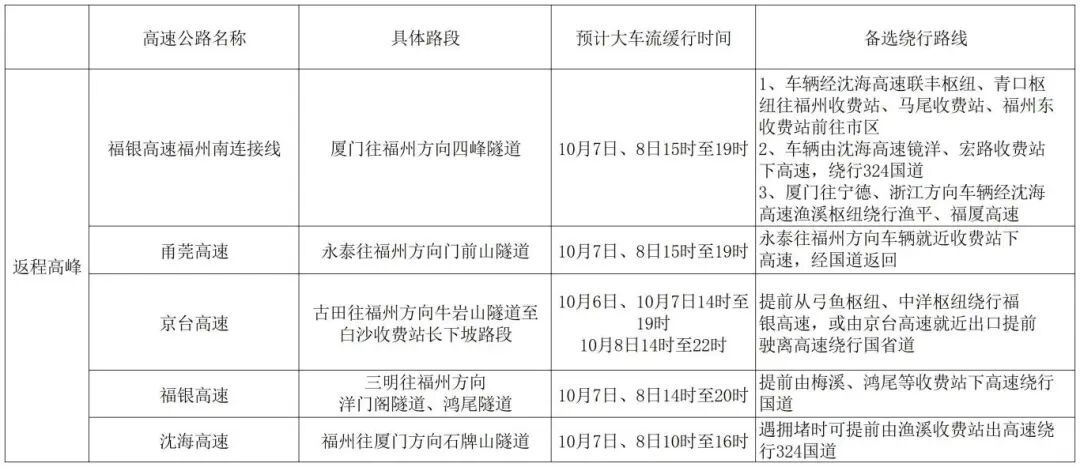 三元区江滨路、高速南/北连接线及沙县国道205线大洲桥引桥路段,10月7日-8日10-20时将出现车流高峰。