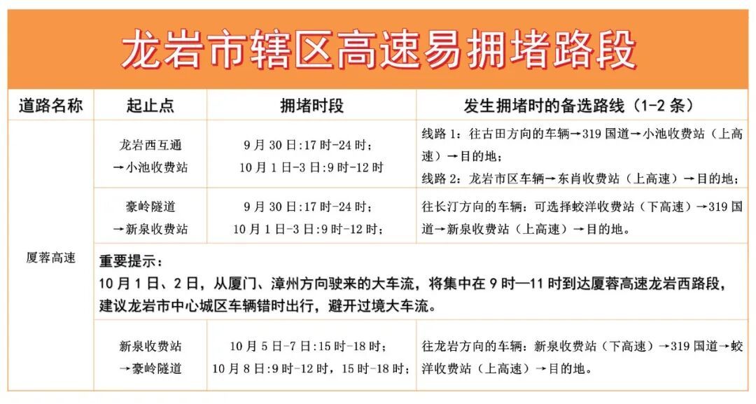 1、罗龙路(石埠灯控到龙岩西高速口)路段。出城、进城集中点,易引发交通拥堵,请驾驶人文明行车、有序通行,尽量避开石埠灯控到龙岩西高速口易拥堵路段,由其他高速口绕行。