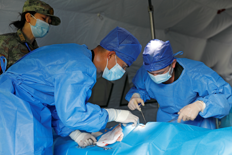 “发现右大腿出血!立即采用旋压式止血带止血!”浓烟中,参赛队员吴文健一边迅速绑扎止血带,一边大声呼叫队友支援。在卫勤专业比武现场,包扎、固定、搬运,动作在模拟炮火声中一气呵成。伤员送达救护所后,军医黎浩岑带领卫生员陈毅之紧锣密鼓地对污染伤口进行清理,把坏死组织和污染物层层剥离,最终伤情得到有效控制。