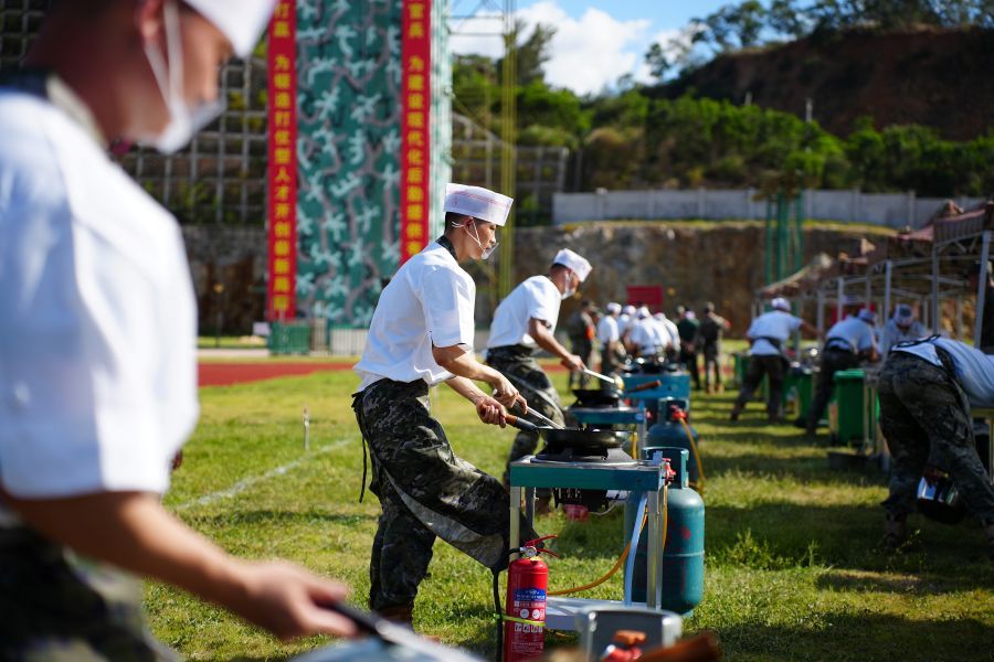 在野战炊事比武现场,各参赛队需要携带炊事设备在长途奔袭后,制作完成相应的饮食保障任务;在财务比武现场,参赛队员不仅精准装订账本,更在繁杂的会计实务操作中分厘必较,为军事行动筑牢信任的基石……