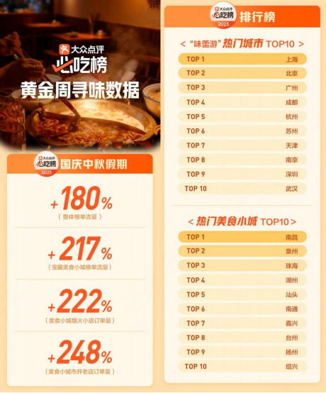 10月9日,大众点评"必吃榜"发布黄金周寻味数据。"十一"假期,"必吃榜"榜单流量整体环比上月增幅接近180%,上海、北京、广州、成都、杭州、苏州、天津、南京、深圳、武汉为"味蕾游"热门城市TOP10;小城小店变身"味蕾游黑马",一众美食小城榜单流量涨超217%,带动当地上榜小店订单量涨超222%、上榜老店订单量涨超248%,南昌、泉州、珠海、湖州、汕头、南通、嘉兴、台州、扬州、绍兴为热门美食小城TOP10。
