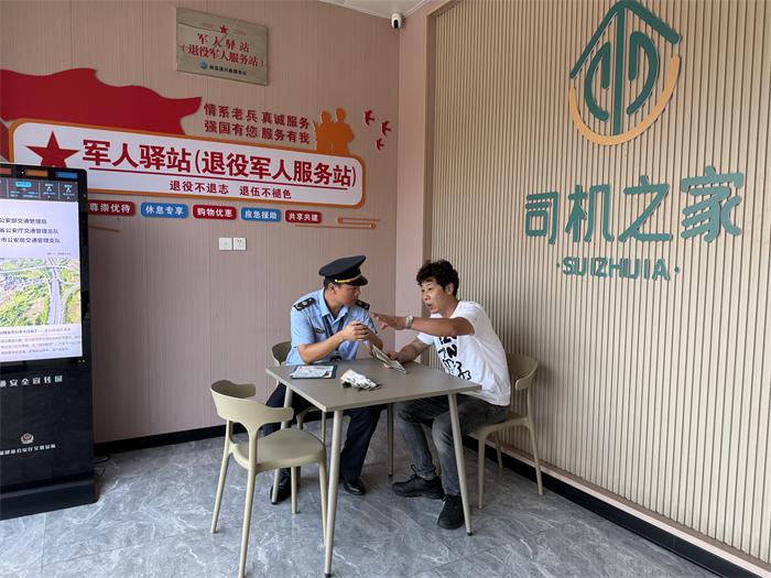 执法人员见状,迅速协调服务区工作人员一同上前协助。三人合力之下,沉重的保险杠被顺利搬入车厢。随后,执法人员引导货车司机到"司机之家"稍作休整,并向其介绍司机之家的功能以及意义,同时围绕道路交通安全、公路法等内容,通过面对面讲解、发放宣传资料等形式,向司机们详细解读政策要求,答疑解惑。同时,兴泰服务区内的"军人驿站(退役军人服务站)"也为退役军人司机提供尊崇优待、休息专享等特色服务,让司机们在国庆出行中感受到暖心关怀。