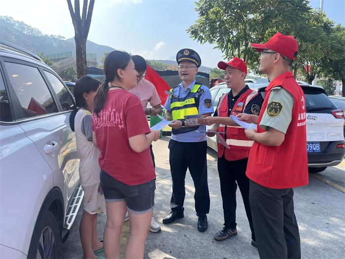除了硬核的科技展示,服务区内还设置了温馨的普法宣传志愿服务点。执法人员针对假期"黑车"非法营运可能增多的情况,重点向旅客普及了"拒乘黑车"的安全知识。志愿者们特别关注到同行的老人与小孩这类防范能力较弱的群体,他们用浅显易懂的语言,结合宣传折页上的案例,耐心讲解如何识别"黑车"、乘坐"黑车"存在的风险以及维权渠道。"原来'黑车'这么不安全,谢谢你们的提醒,我们出行一定会选择正规车辆!"一位带着孩子的王女士在听完讲解后表示。
