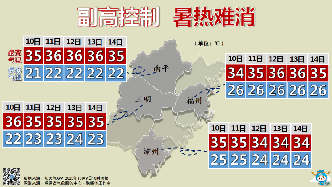 气温方面,我省大部地区午后最高气温在35℃上下,暑热难消。其中,中北部表现最突出,预计未来一周,南平高温日数可达6天,三明、福州将达到5天,福州还将打破最晚高温日纪录。