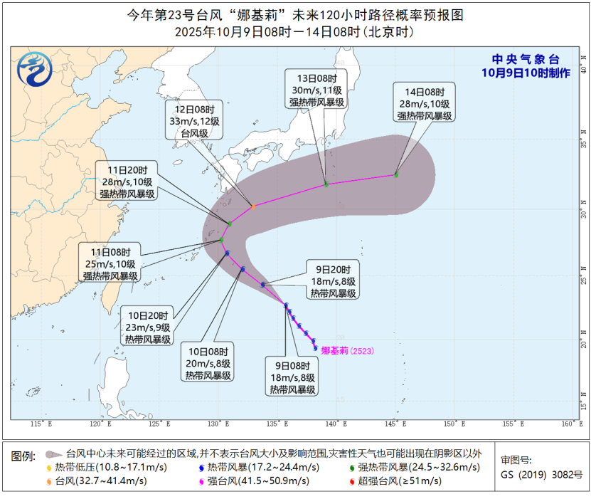预计,“娜基莉”将以每小时20公里左右的速度向西北方向移动,强度缓慢增强,逐渐向日本以南洋面靠近,并将于11日前后转向东北方向移动。受其影响,10—11日东海东部的部分海域有6~8级风,阵风9~11级。