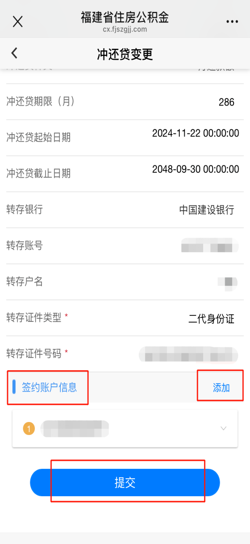 ③选择“贷款银行”——填写“商业贷款账号”——“签约账户信息”点击“添加”公积金账户(有补贴户需重复此步骤)——账户添加完毕确认无误,点击“提交”
