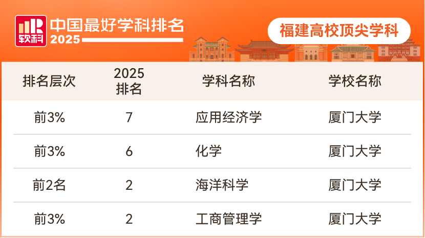 在2025软科中国最好学科排名中,福建共有11所高校149个学科上榜,其中包括139个一级学科和10个专业学位类别。此次,福建共有26个中国一流学科(含一级学科和专业学位类别),并拥有4个中国顶尖学科。