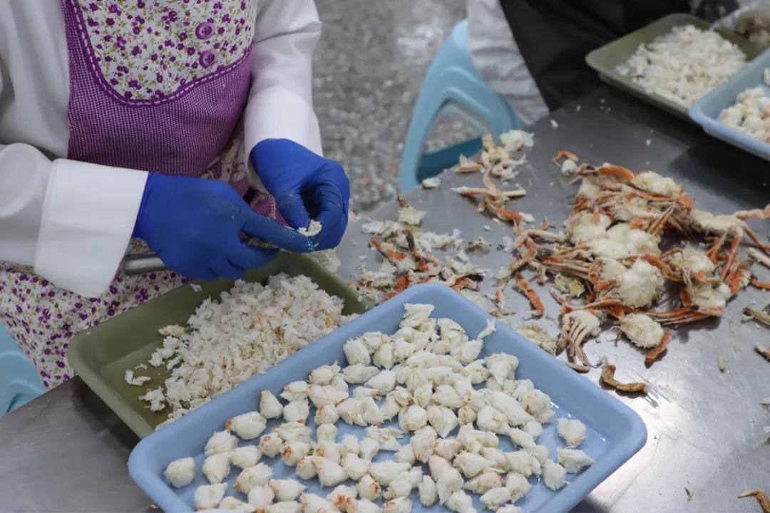 走进厂区,车间分工清晰明确,形成了从初加工到精加工的完整流水线。全方位清洗去除杂质后,女工们熟练地剪掉蟹的两只大脚、剔除蟹胃、蟹腮,一系列操作只为让蟹肉与蟹壳提前分离,为后续出肉率提升打下基础。