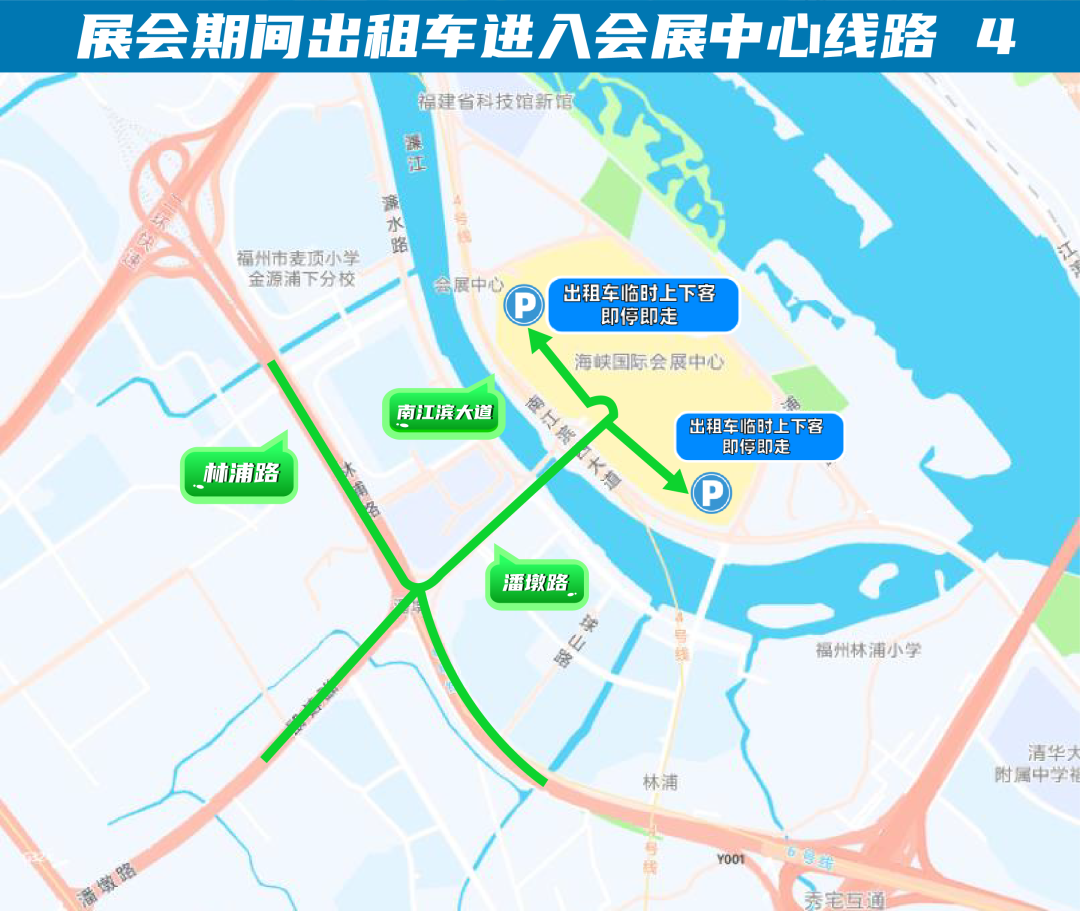 3、南江滨西大道(上渡、仓前、连江路方向)来的车辆可由南江滨西大道——会展西路——会展西路出租车下车点。