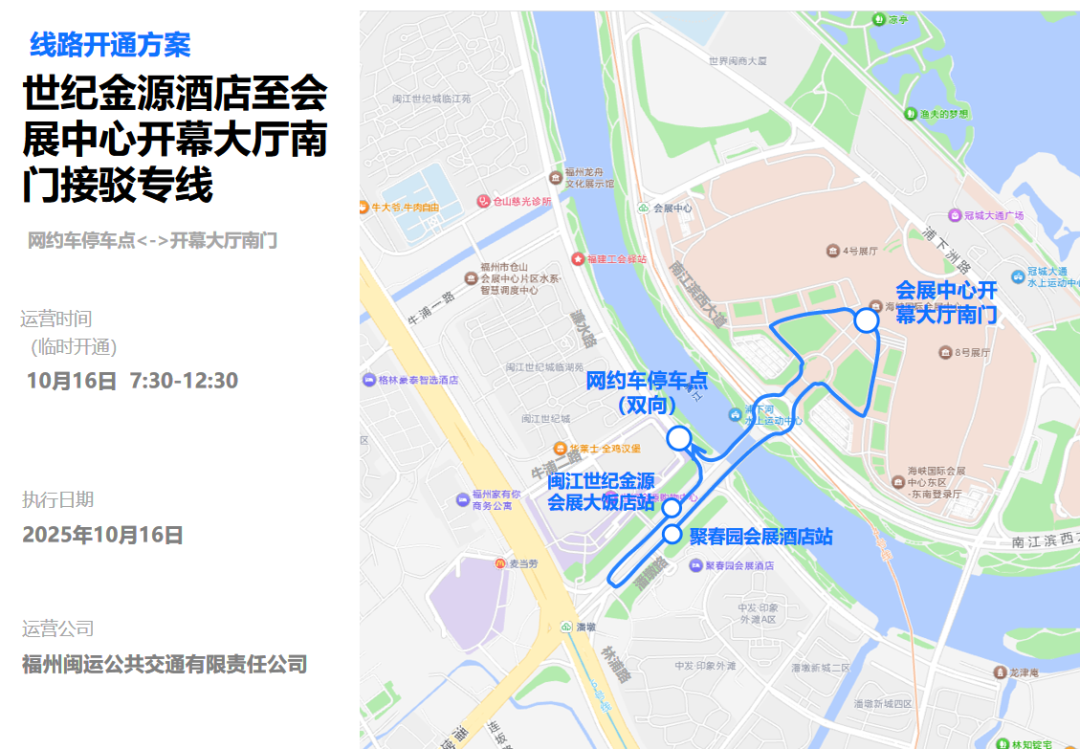 潘墩路濂水路口西侧路段网约车下车点——濂水路——潘墩路(林浦路口调头)——会展环岛——会展中心南广场,车辆停靠闽江世纪金源会展大饭店公交车站和聚春园会展酒店公交车站(人员凭大会专用证件上下车)。