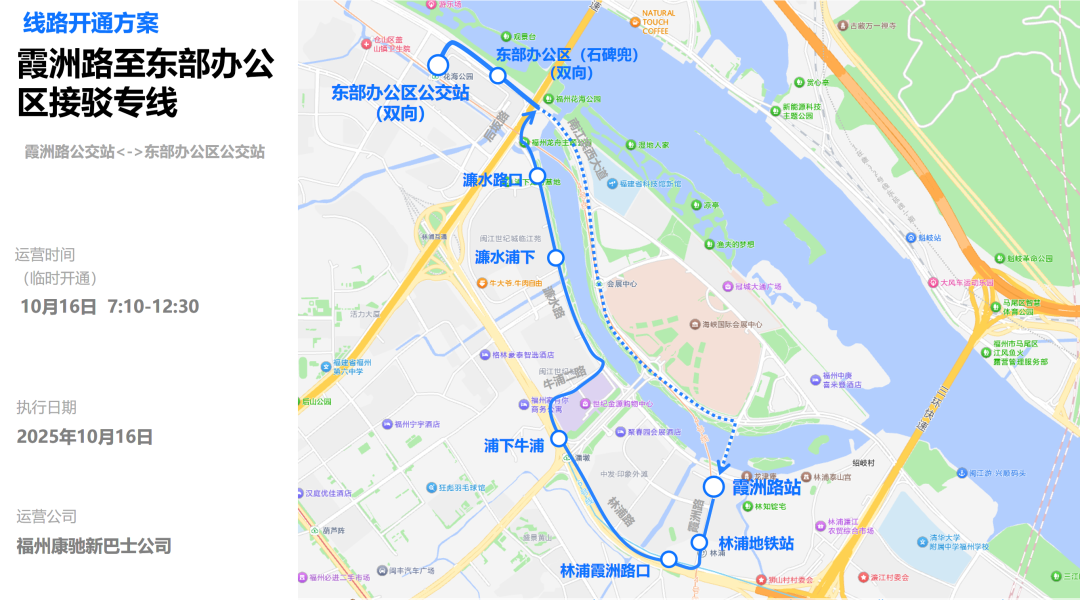 开通霞洲路至东部办公区接驳专线,线路:霞洲路公交车站始发——霞洲路——林浦路——牛浦二路——濂水路——后坂路——南江滨大道——南社二路——东部办公区公交站——南社二路——南江滨大道——霞洲路,停靠站点:霞洲路站、林浦地铁站、林浦霞洲路口站、浦下牛浦站、濂水浦下站、濂水路口站、东部办公区(石碑兜)站、东部办公区(南社二路)站,返程仅停靠东部办公区(石碑兜)站。