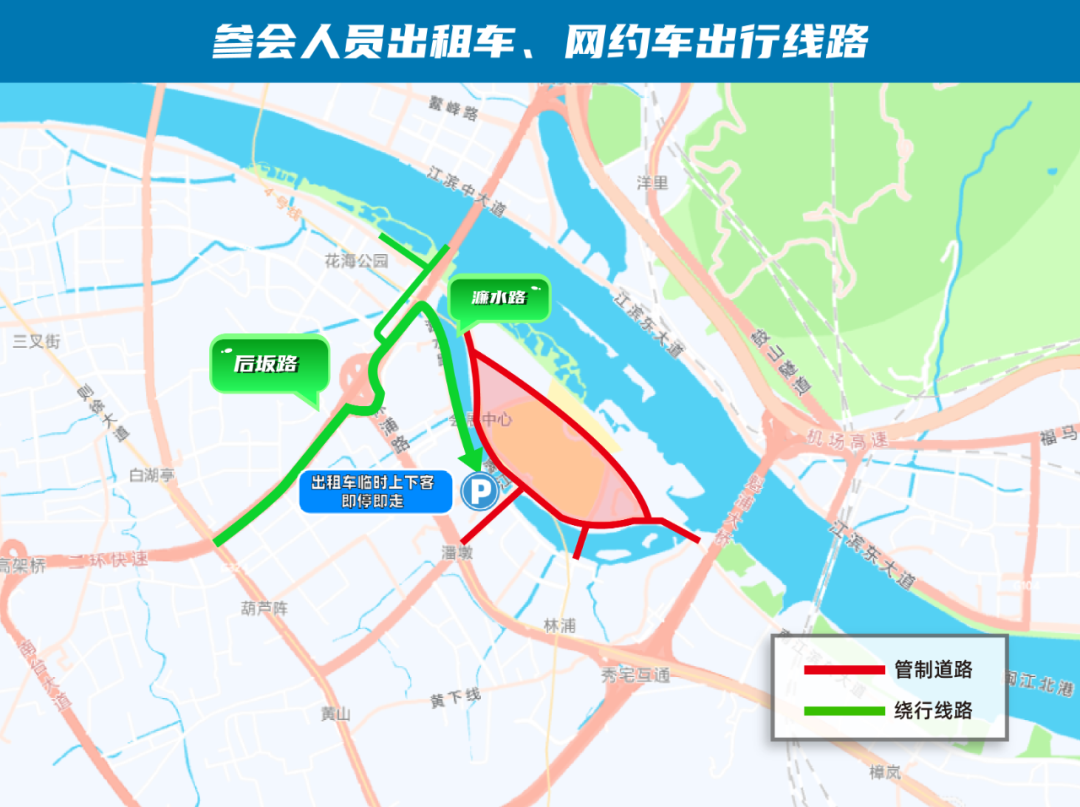 1、三环路方向来的车辆可由秀宅互通南江滨大道出口进入三环路辅路,后经南江滨东大道——浦下洲路——会展东路——会展东路出租车下车点。