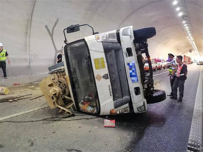 当日下午3时11分,一辆运送打桩机的货车从龙岩漳平出发前往泉州工地,在行驶至永漳高速华安路段青良山隧道内时,因驾驶员操控不慎发生侧翻,车辆横亘在主车道与超车道上,导致交通瞬间堵塞。接到报警后,漳州高速执法支队三大队立即启动联动应急预案,执法人员第一时间赶赴事故现场。