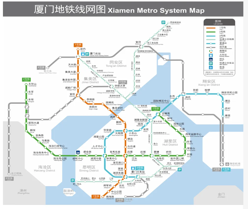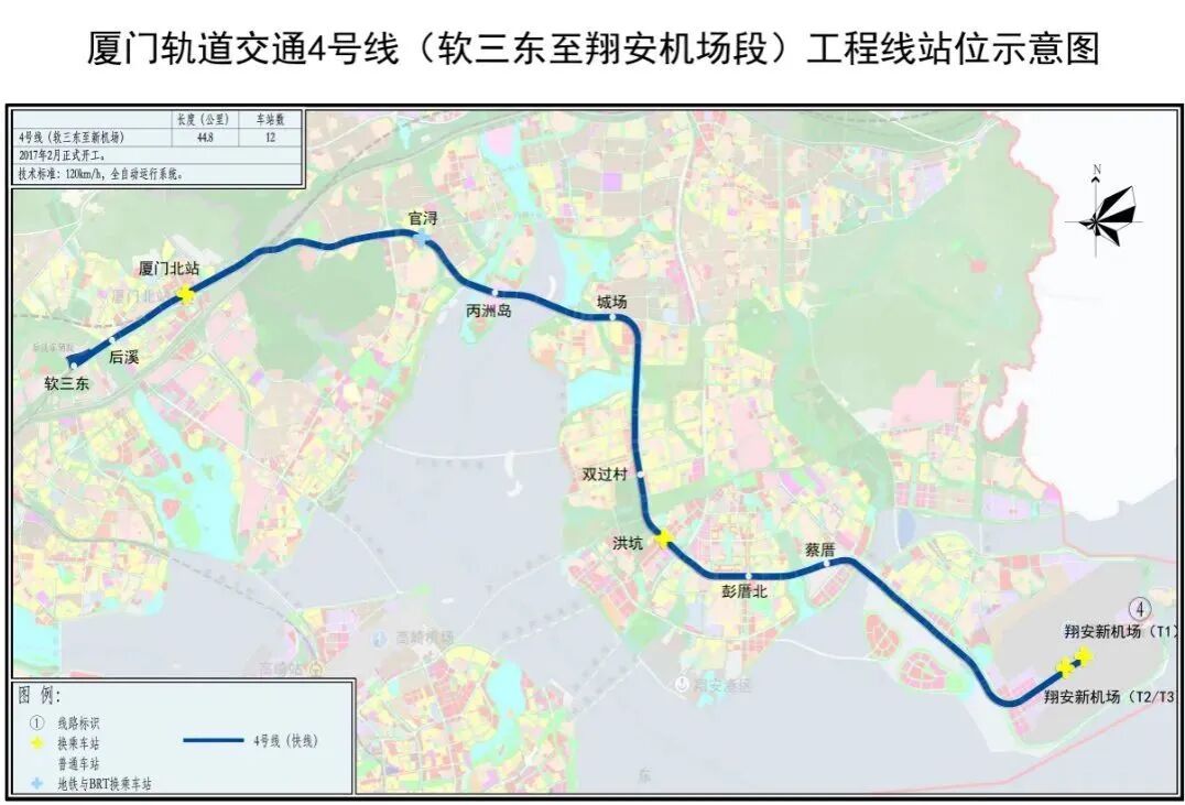 厦门地铁4号线全长45公里,为岛外环湾骨干快线,起于软三东站,止于翔安机场站,沿途顺次连接集美、同安、翔安3个城区,更将厦门北高铁站、翔安新机场两大交通枢纽紧密相连,开通运营后可有效承担厦门市域环湾客流快速交换功能。