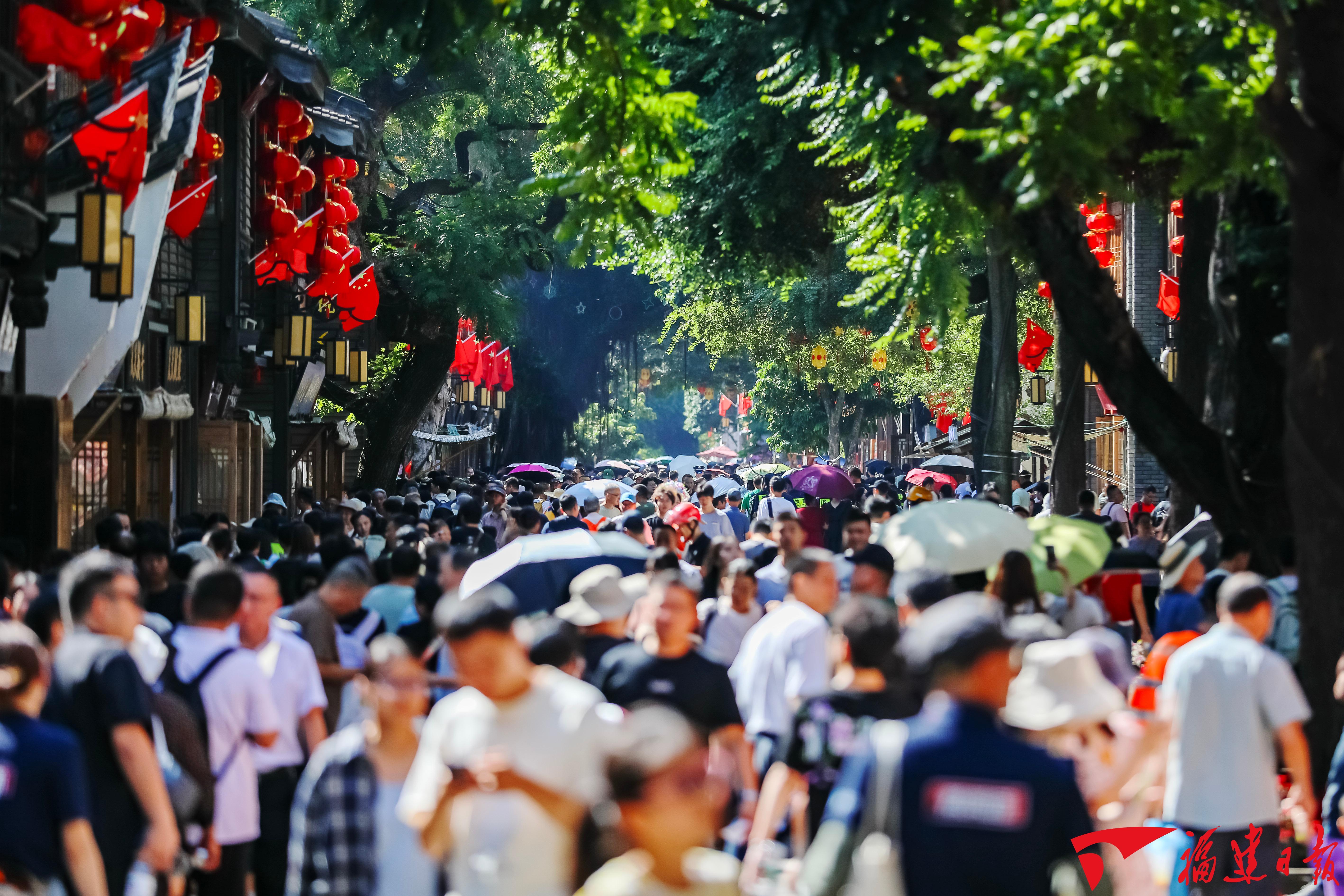2025年10月2日,在福建省福州市的三坊七巷历史文化街区,游客正在街区内游览。 谢贵明 摄