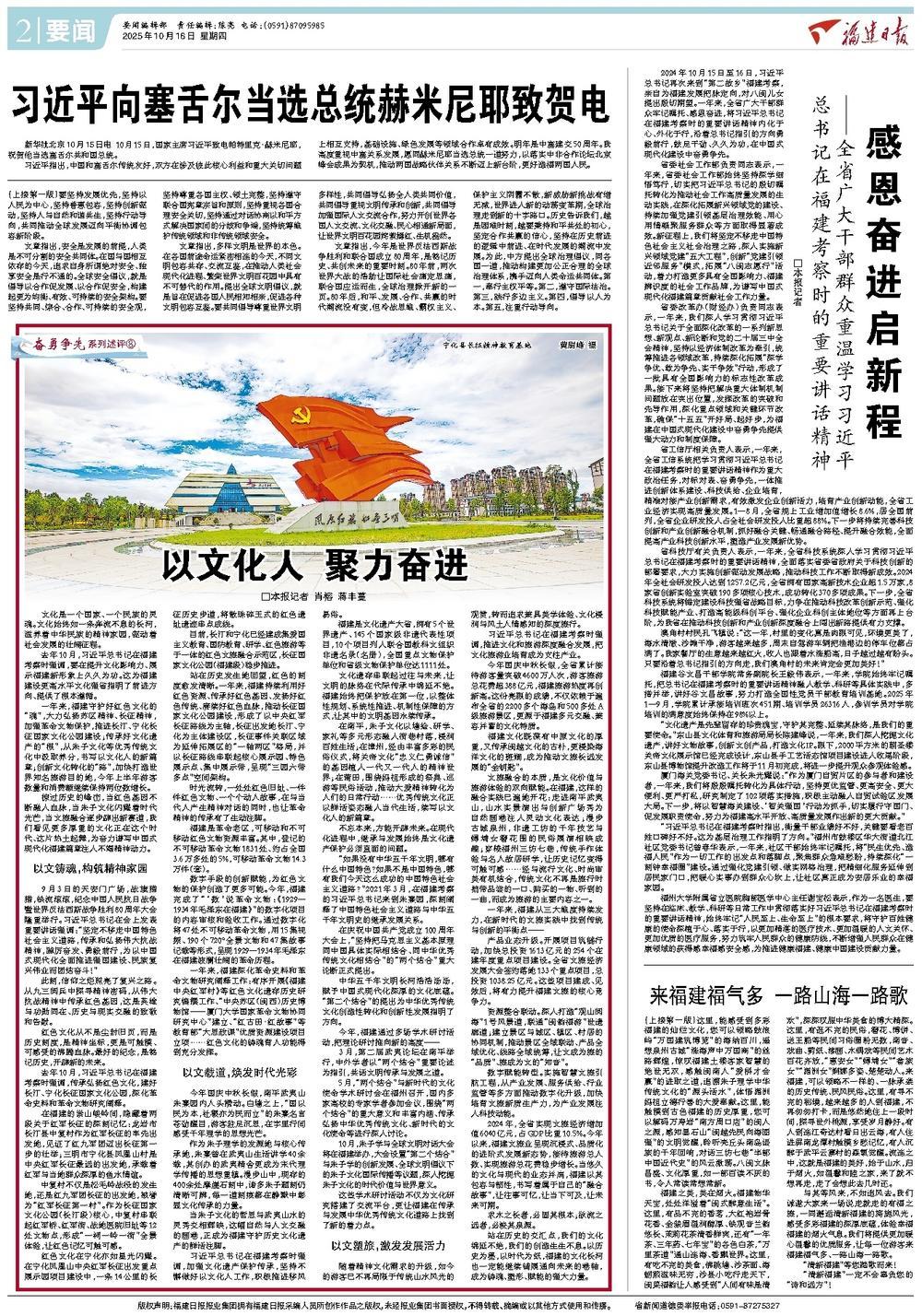 去年10月,习近平总书记在福建考察时强调,要在提升文化影响力、展示福建新形象上久久为功。这为福建建设更高水平文化强省指明了前进方向、提供了根本遵循。