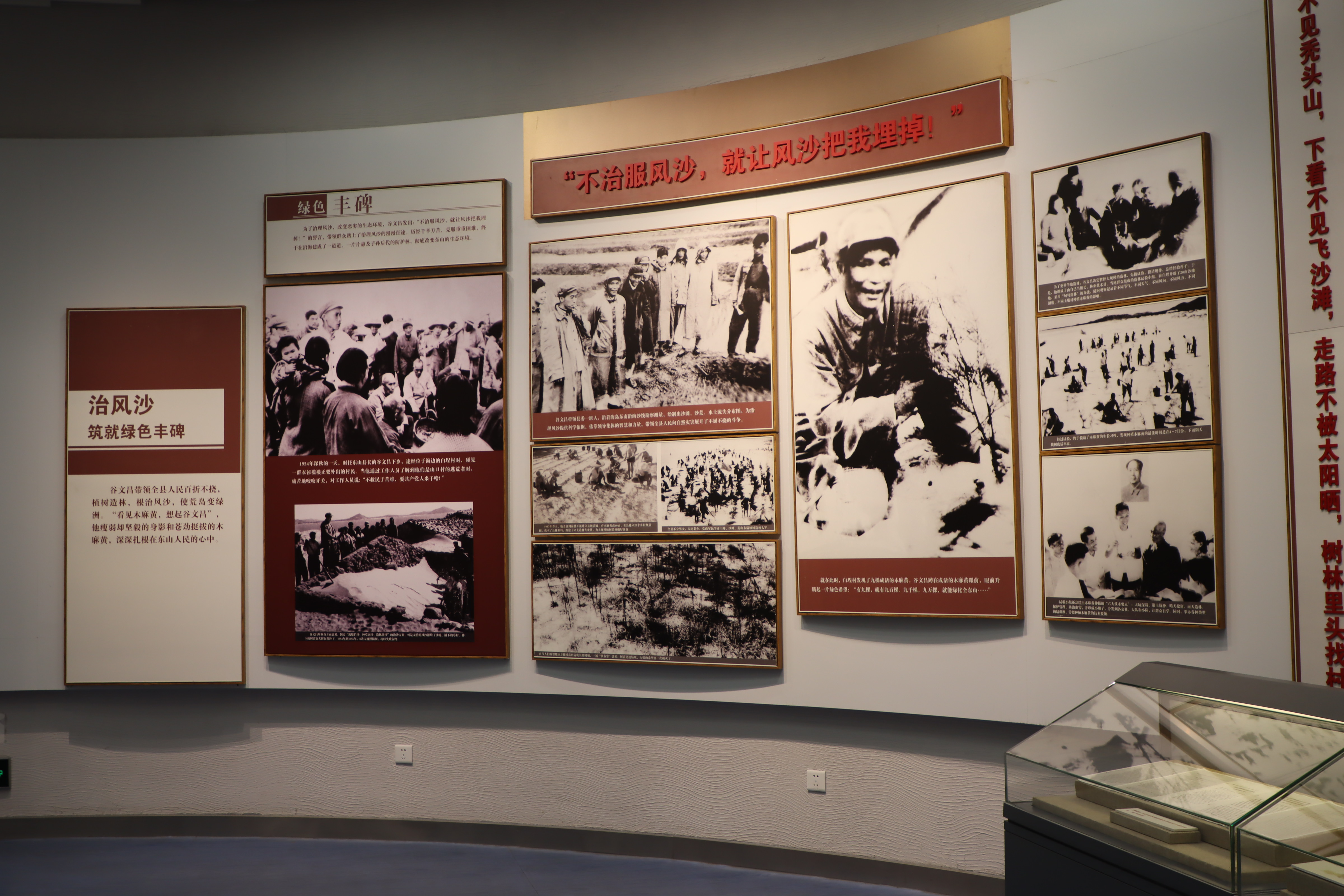 展柜里,泛黄的笔记本上密密麻麻记录着谷文昌的治沙笔记,字里行间满是与风沙抗争的决心;墙面上,一幅幅老照片定格着他带领群众扛树苗、挖树坑的艰辛场景,粗糙的双手、沾满沙土的裤脚,诉说着共产党人的实干担当。