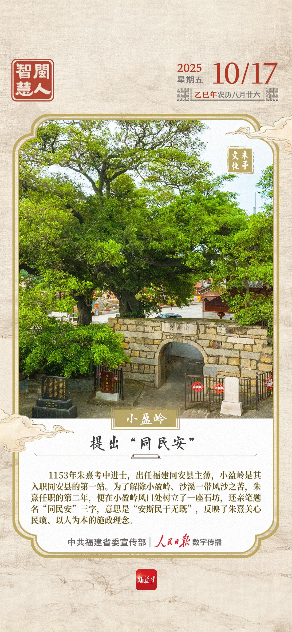 1153年朱熹考中进士,出任福建同安县主薄,小盈岭是其入职同安县的第一站。为了解除小盈岭、沙溪一带风沙之苦,朱熹任职的第二年,便在小盈岭风口处树立了一座石坊,还亲笔题名“同民安”三字,意思是“安斯民于无既”,反映了朱熹关心民瘼、以人为本的施政理念。