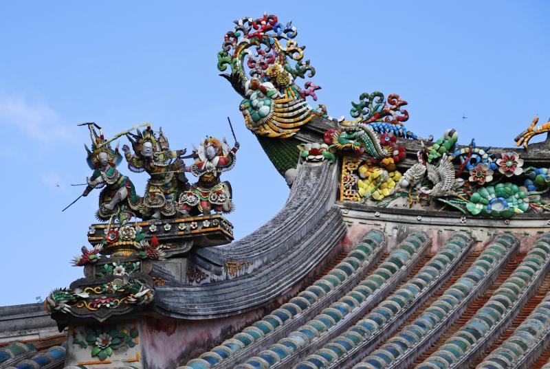 关帝庙屋脊上剪瓷雕造型精美绝伦