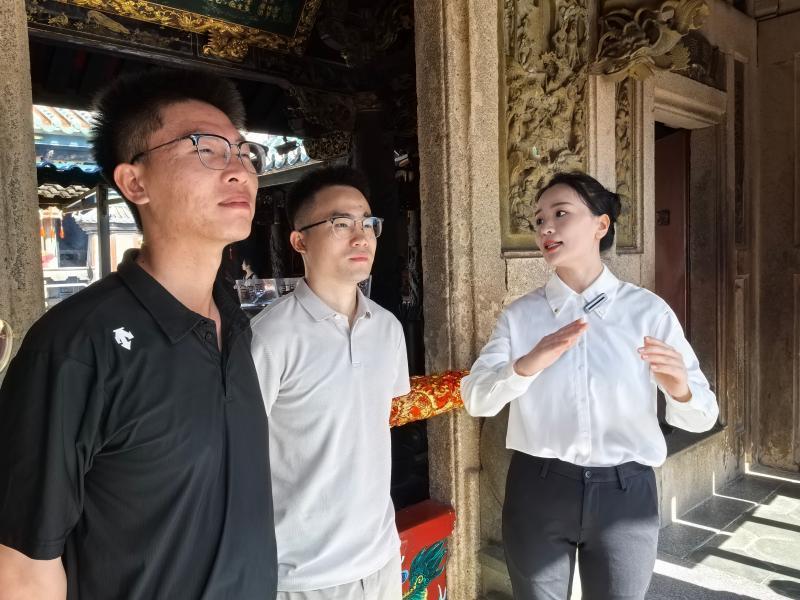 “太子亭屋脊上的剪瓷雕工艺是福建省非物质文化遗产之一。工匠们先用泥胎捏制各式造型,再将彩瓷剪裁、打磨成大小形状各异的小瓷片,逐颗镶嵌。工序虽然繁复,但却让这些造型拥有了历经风雨剥蚀和岁月洗礼仍鲜艳如初的色彩。”韩冬亲和地微笑着,将这座全国重点文物保护单位的文物之美和文化底蕴向参观者娓娓道来。