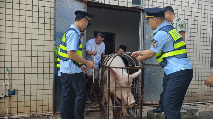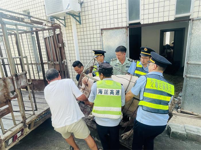 10月14日早上9时许,货主带领一名工人到达龙掘东服务区,厦门高速执法支队执法人员与服务区工作人员在核验信息后,共同配合将生猪逐一赶进专用的铁制笼子,在几人合力下才抬上车辆。