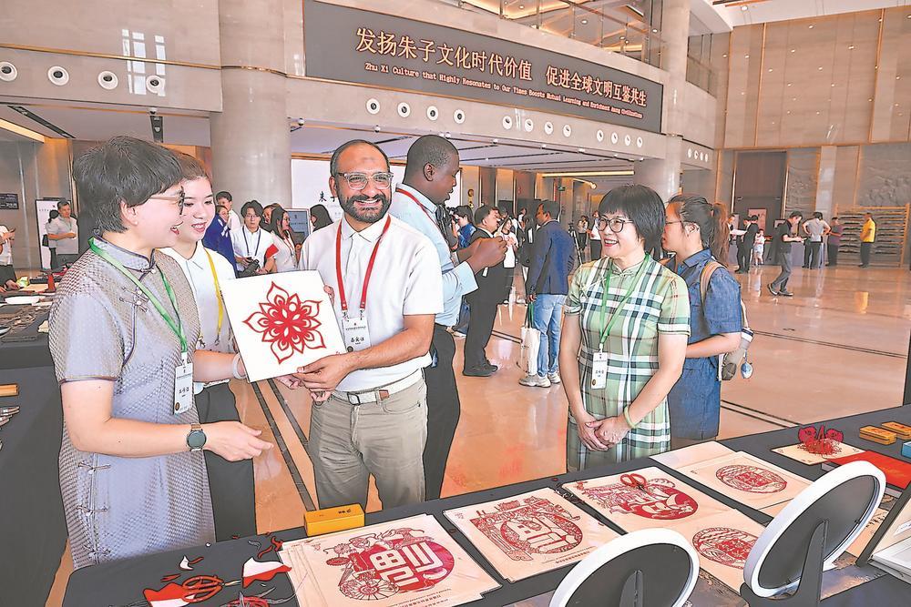 10月18日,由中国社会科学院、国际儒学联合会和福建省人民政府共同主办的朱子学与全球文明对话大会暨第四届考亭论坛在福建省南平市举行。大会以“发扬朱子文化时代价值,促进全球文明互鉴共生”为主题,设置开幕式与主旨报告、第四届考亭论坛平行分论坛、主题圆桌沙龙、“书院文化”学术考察暨采风传播等四大主题活动。图为与会嘉宾在现场体验福建浦城剪纸技艺。姜克红 摄