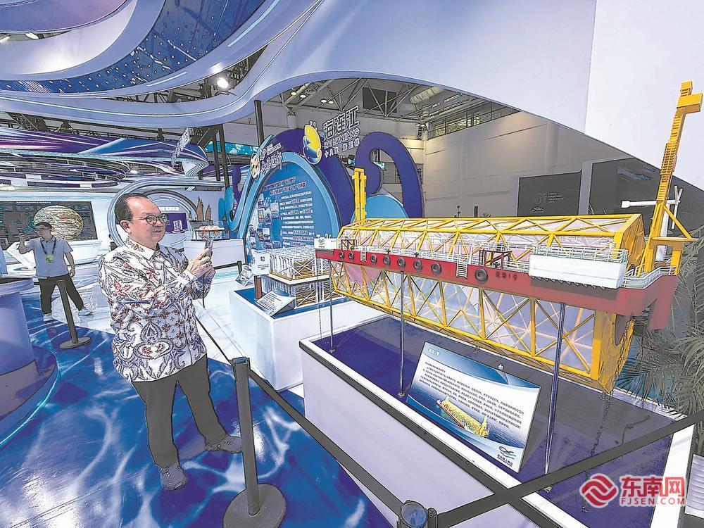 观众在拍摄“乾动2号”深远海养殖平台的模型。福建日报记者 张文奎 摄