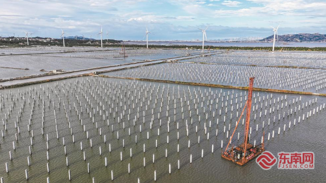 近日,在位于莆田湄洲忠门镇北江围垦的华润忠门A区100MW渔光互补光伏电站项目建设现场,已完成的桩基在海面上整齐排列,与波光粼粼的水面相映成趣。
