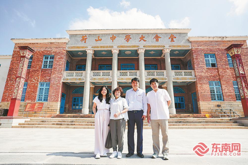18日,吴洁嫦(左二)与三个儿女在荷山中学大会堂前合影。福建日报记者 汪洁 摄