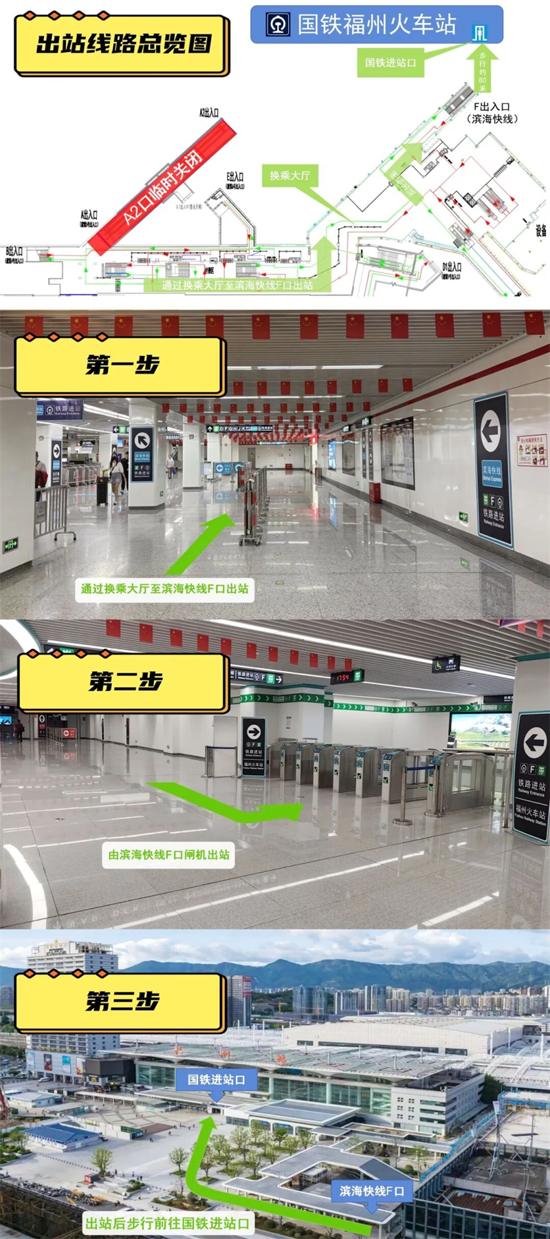 东南网10月21日讯(通讯员 黄伟清 刘舒 记者 刘维斯)为配合福州火车站南广场综合改造工程施工,10月20日起,地铁1号线福州火车站A2出入口临时关闭,待福州火车站南广场综合改造工程完工后重新开放(预计2027年初),期间市民乘客可从其他出入口正常通行,前往国铁福州火车站的乘客可由滨海快线F口出站前往。具体流线如图所示: