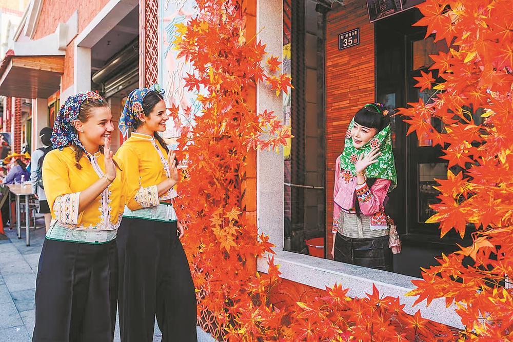 代表团成员在惠女海韵休闲街区体验惠安女独特的服饰文化。