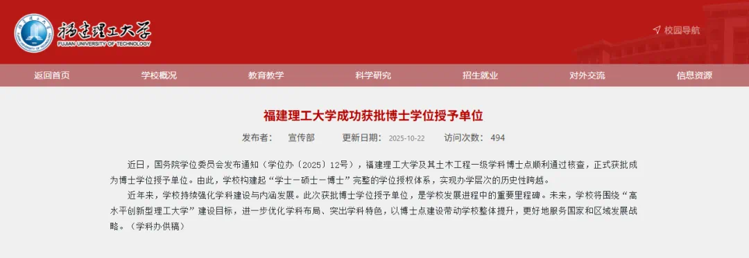 近日,国务院学位委员会发布通知(学位办〔2025〕12号),福建理工大学及其土木工程一级学科博士点顺利通过核查,正式获批成为博士学位授予单位。由此,学校构建起“学士—硕士—博士”完整的学位授权体系,实现办学层次的历史性跨越。
