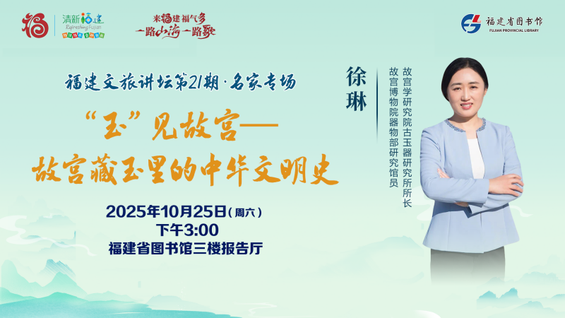 2025年10月,习近平总书记来闽考察一周年之际,适逢故宫博物院建院100周年,为深入学习贯彻习近平文化思想,着眼“在提升文化影响力、展示福建新形象上久久为功”,10月25日(周六)下午3:00,福建文旅讲坛第21期·名家专场将邀请故宫博物院器物部研究馆员、故宫学研究院古玉器研究所所长徐琳做客福建省图书馆,带来专题讲座“‘玉’见故宫——故宫藏玉里的中华文明史”。