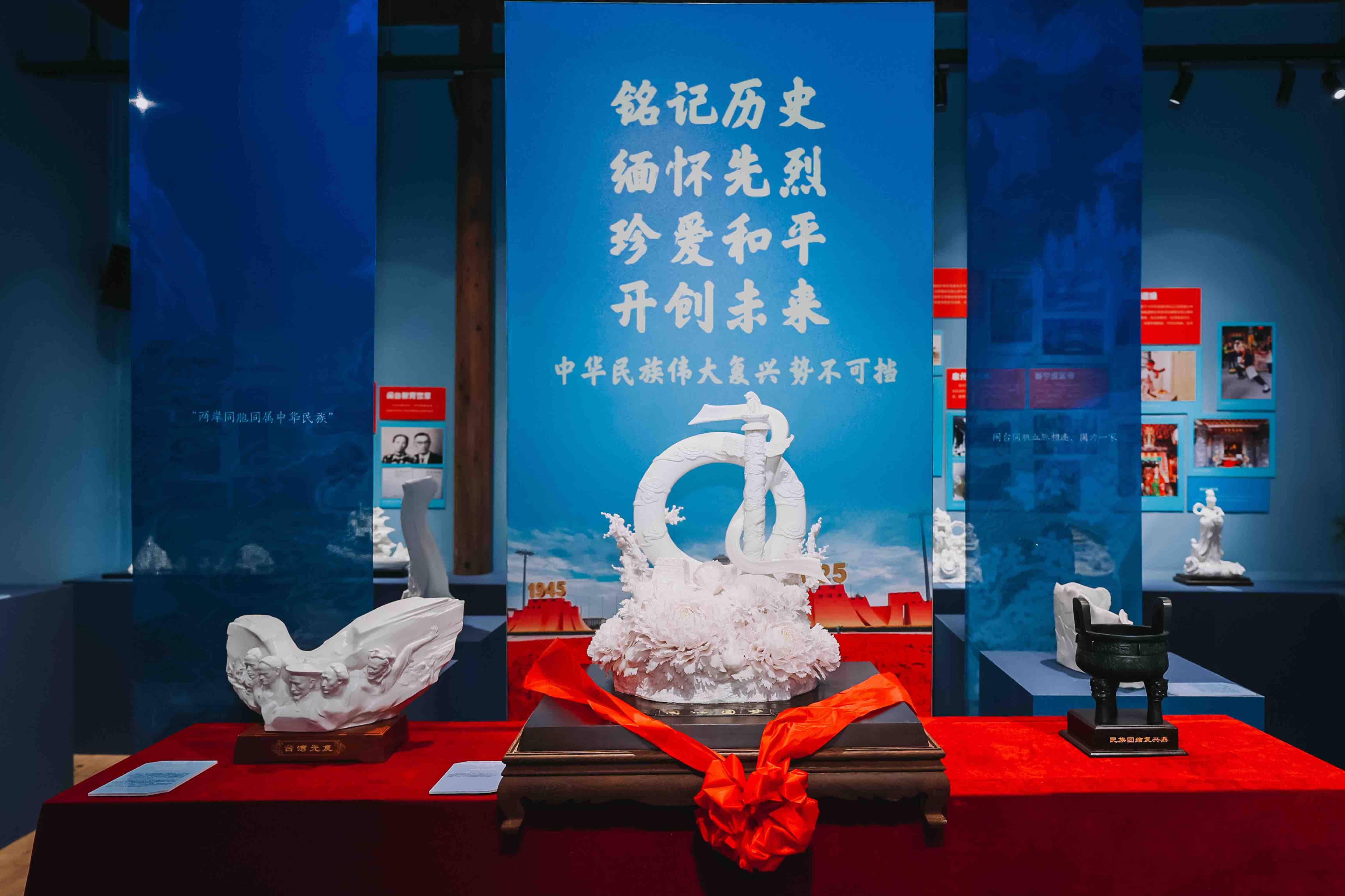 记者在现场看到,主题陶瓷展以德化白瓷艺术为媒介,运用《中华民族交往交流交融史料·福建卷》《中国少数民族文物图谱·福建卷》、闽台宗教和民间信仰源流梳理等成果,以闽台共有文化符号为载体,设置“自古一家”“祖先祖祠”“祖庭祖庙”“祖地祖国”四个版块,生动展示了先民跨海拓垦、繁衍生息的迁台记忆,两岸同胞共御外侮、携手奋斗的英雄史诗,两岸血脉相连、命运与共的壮阔历程。