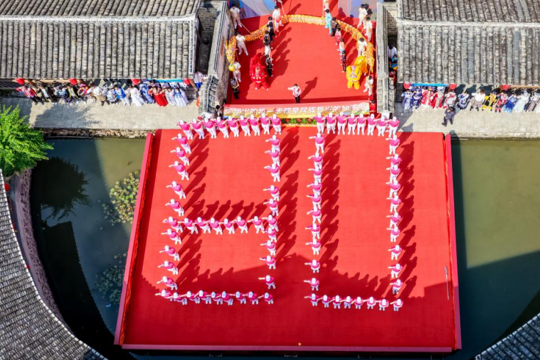 火炬经接力传递,80名两岸各民族代表自复兴堡起跑,一路感受永安这座城市的红色文化与历史印迹。为铭记这一时刻,“跑友”排列成“80”造型,齐声高唱《龙的传人》,将现场气氛推向高潮。