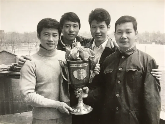 1980年,林亚阔(右一)在担任福建省乒乓球队男队主教练期间,率队获得无锡全国甲级联赛冠军