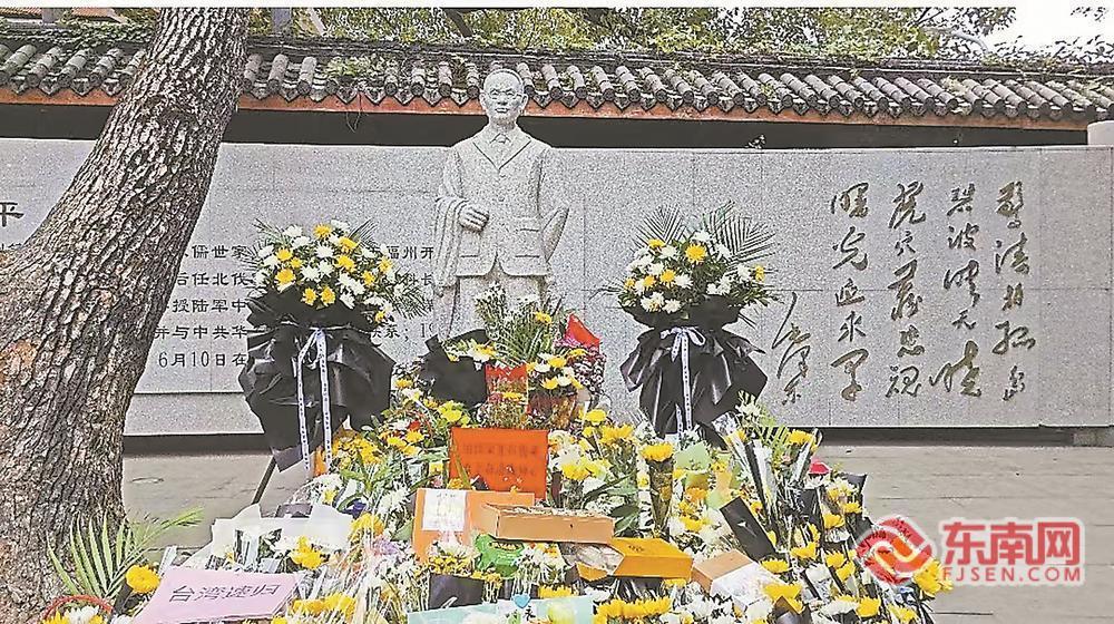 吴石故居的雕塑前摆满了祭奠的鲜花。